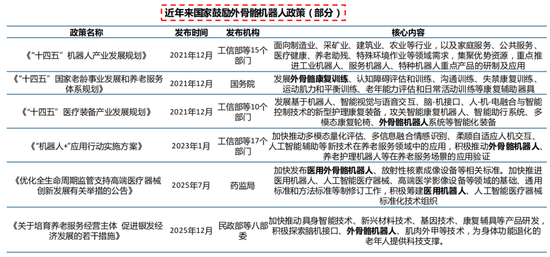 国家层面不断出台政策,从技术攻坚、市场培育、标准建设等方面大力支持外骨骼机器人产业发展。2021年以来,国务院、工信部、药监局等部门陆续发布政策, 从顶层设计层面支持机器人行业发展。 2021年12月,工信部等15个部门发布《 “十四五”机器人产业发展规划》 ,提出鼓励机器人在制造业、医疗、养老等领域的研制及应用 ;2023年1月,工信部等17个部门发布《“机器人+”应用行动实施方案》 ,明确提出积极推动外骨骼机器人、养老护理机器人等在养老服务场景的应用验证 ;2025年7月,国家药监局发布《优化全生命周期监管支持高端医疗器械创新发展有关举措的公告》 ,提出加快发布医用外骨骼机器人等相关标准,积极筹建医用机器人标准化技术组织。
