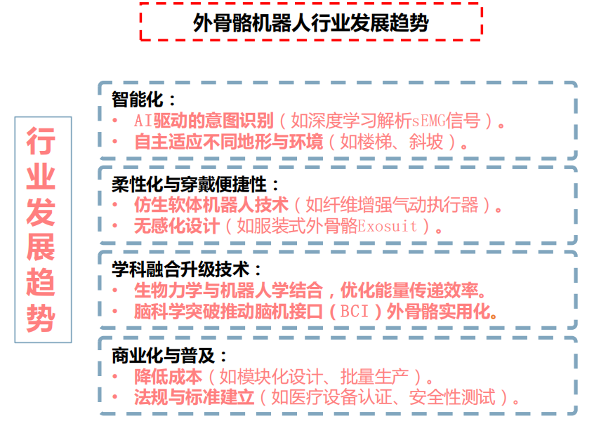 技术门槛 :外骨骼机器人融合了人工智能、传感、人体工学、动力和电子等多种技术 ,传感器、控制系统、仿生机构设计、新材料等技术的融合 ,使得产品性能持续提升 ,更加适应多样化的应用场景。此外 ,外骨骼机器人的运动识别精度和人机交互自然度也是关键难题。