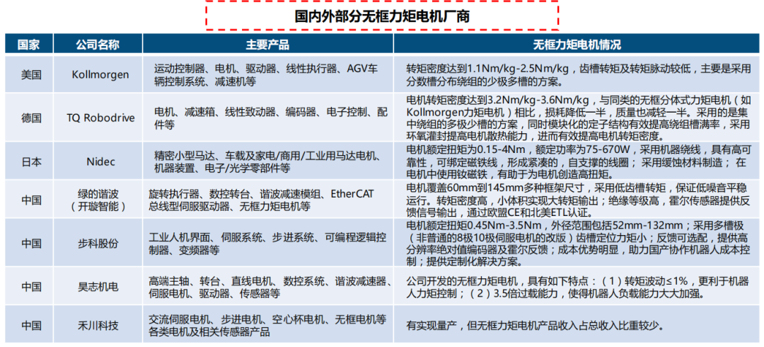 外资无框力矩电机厂商占据主要市场份额 ,国内厂商发展快速。国外无框力矩电机代表性厂商有TQ Robodrive、Kollmorgen、Allied motion、Aerotech、TMT ECH、Axsys、 ETEL、 Parker、Muirhead Aerospace、Gomtec、 Nidec等 ,用于协作机器人关节上的无框力矩电机厂商主要有Kollmorgen和TQ Robodrive。国内涌现绿的谐波旗下的开璇智能、步科股份、昊志机电、禾川科技等研发、制造和生产无框力矩电机的科技型企业 ,但产品的转矩密度、过载能力、转矩脉动与国外高端无框力矩电机相比具有一定差距。