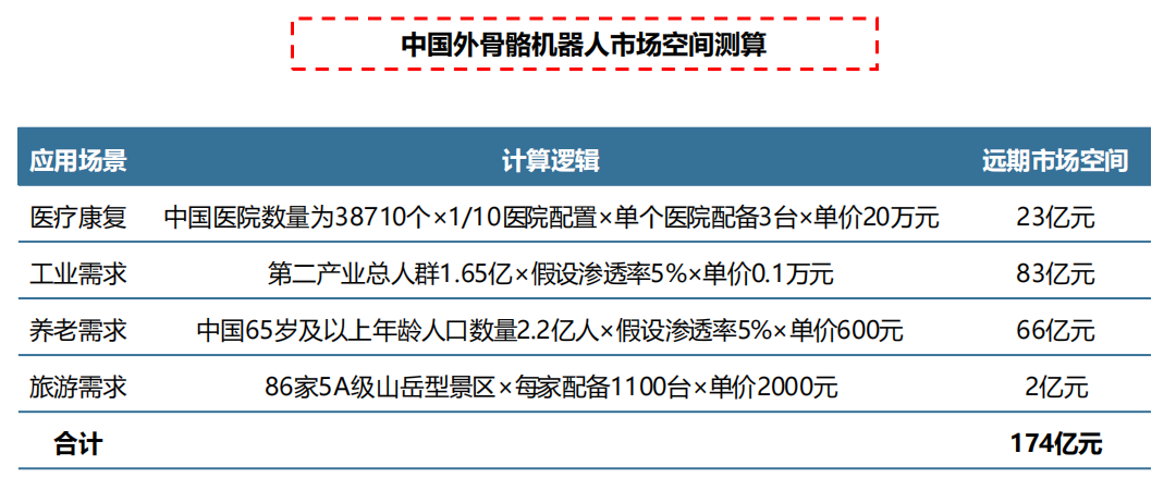 不同应用场景简单测算外骨骼机器人国内远期市场空间: