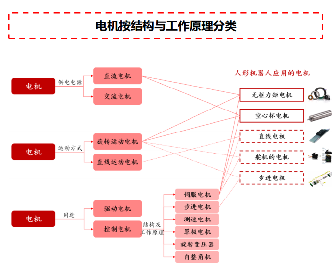 Optimus主要应用两类特殊的伺服电机 ,即无框力矩电机和空心杯电机。参考Optimus方案 ,其躯体共有40个执行器 ,每个执行器都会搭配一个电机 :① Optimus躯干+腿部+手臂的旋转执行器和线性执行器均使用无框力矩电机 ;这些部分应用的电机对扭矩、 牵引力要求较高 ,我们判断可满足要求的电机类型还包括直线电机、 步进电机。 ②Optimus手部执行器使用的是空心杯电机 ,我们判断可满足要求的电机还包括舵机电机等。