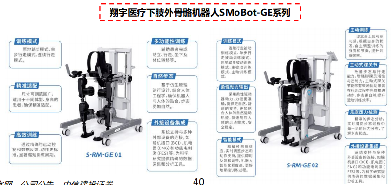 以医用级康复外骨骼机器人为主 ,同时布局消费级外骨骼机器人产品。康复机器人针对偏瘫、截瘫、踝关节损伤、脊髓损伤等肢体功能障碍人群 ,应用人机工程学、视觉图像处理、机器人运动控制、高精度传感器行业等相关技术 ,对于提高康复效率、保证康复质量、降低医护人员劳动强度具有重要意义。公司依托自身在康复领域的技术积累 ,前瞻性组建成立“康复机器人实验室” 聚焦医用级产品研发。短期来看 ,公司在研外骨骼机器人仍以医用为主 ,适用于康复医院、社区康复中心等场景 ;中长期来看 ,公司将逐步 ,完善家用版产品 ,针对术后康复、居家训练及老年人辅助行走等方向 ,打造“ 医院—家庭”双场景产品的布局。