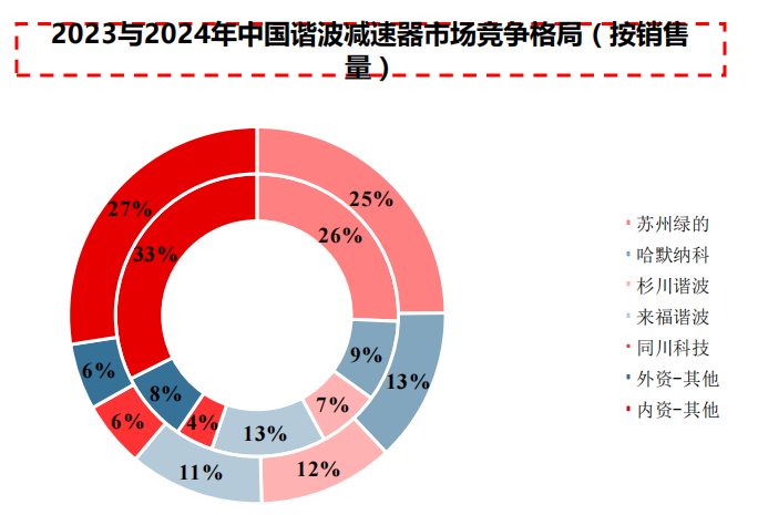 MIR睿工业数据显示 ,2020至2024年间,谐波减速器内资品牌实现规模快速扩张。相比之下,外资品牌同期销量波动较大,整体增长乏力。展望2025至2028年,内资品牌预计将维持年均20%以上的强劲增长,至2028年销量规模预计将达外资品牌的近十倍。根据MIR数据,2024年国产品牌绿的谐波销量领先,外资头部厂商哈默纳科份额有所提升,行业份额向头部聚集。