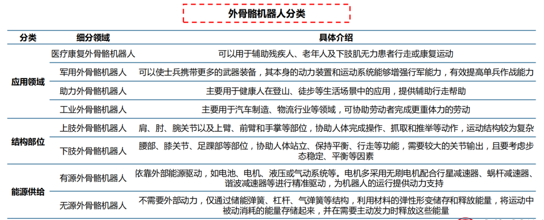 外骨骼机器人种类多样:根据结构部位,外骨骼机器人可以分为上肢外骨骼、下肢外骨骼和全身外骨骼,也可以进一步细分为膝关节、肩部、腰部、足踝部等部位外骨骼。根据应用领域 ,可以分为行动助力、医疗康复、军事用途、工业用途等功能差异的具体领域。根据能源供给 ,可以分为有源外骨骼和无源外骨骼。