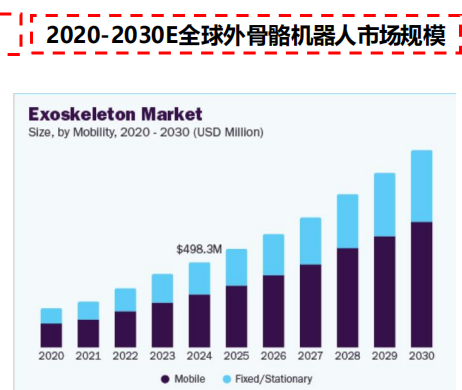 根据Grand View Research于2025年5月发布的数据 ,2024年全球外骨骼机器人市场规模估计为5.0亿美元 ,预计到2030年将达到12. 5亿美元 , 2025年至2030年复合年增长率为16.27%。全球快速增长的老年人口 、中风发病率上升 ,以及汽车、军事、国防和建筑等多个行业产品使用率的提 升 ,是推动外骨骼市场增长的主要动力。