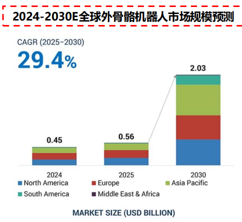 根据Markets and Markets于2025年5月发布的数据 ,2025年全球外骨骼机器人市场规模预计将达到5.6亿美元 ,并且预计将于2030年达到20.3亿美元 ,预测期内CAGR达到29.4%。外骨骼机器人需求增加主要由于机器人技术的进步、工作场所安全需求提升以及在医疗保健、军事部门等对于辅助技术的需求增长。