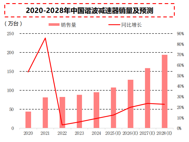 近年来中国谐波减速器销量呈现稳步增长态势。 中国谐波减速器销量由2020年43万台提升至2024年的95万台,行业进入规模化发展阶段。随着技术成熟、成本下降及下游自动化渗透率提升,谐波减速器市场有望从结构性增长迈向全面普及阶段,成为支撑中国高端制造与智能装备发展的关键环节。