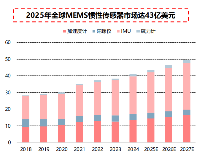 2025年全球MEMS中加速度计、陀螺仪、 IMU、磁力计市场规模分别达14.35、3.50、24.14、 1.39亿美元 ,合计规模43.38亿美元(约合人民币316亿元)。随着下游应用对集成化的要求提升 ,IMU产品的市场空间与应用占比将逐步增大。