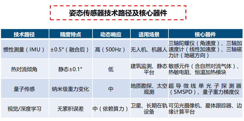 姿态传感器是一种测量物体在三维空间中方向或角位置的设备 ,通过测量物体的角度、方向和加速度等参数来确定物体的姿态 ,广泛应 用于航空航天、机器人、汽车、消费电子、 医疗设备等多个领域。姿态传感器的技术路径多样 ,根据测量原理、核心器件和应用场景的差异 ,主要可分为惯性测量( IMU )、热对流倾角传感器、量子传感、视觉与深度学习融合等 ,选型时需综合考量精度需求、动态环境、功耗成本 及部署场景等因素 ,IMU为当前主流。