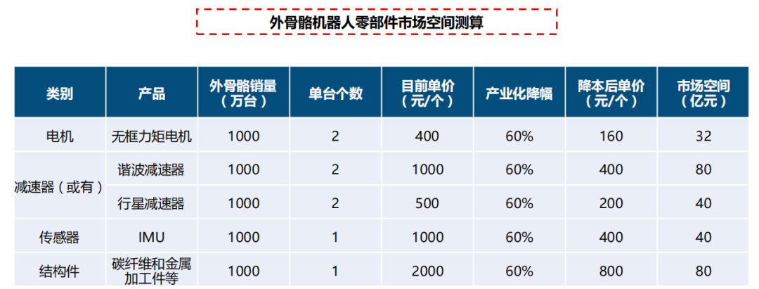 假定在产品规模化生产降本后降价幅度为60% ,则预计一千万台外骨骼需求对应的无框力矩电机市场空间为32亿元 ,谐波减速器市场空间80亿元 ,行星减速器市场空间为40亿元 ,IMU市场空间为40亿元 ,为相关零部件显著扩容。