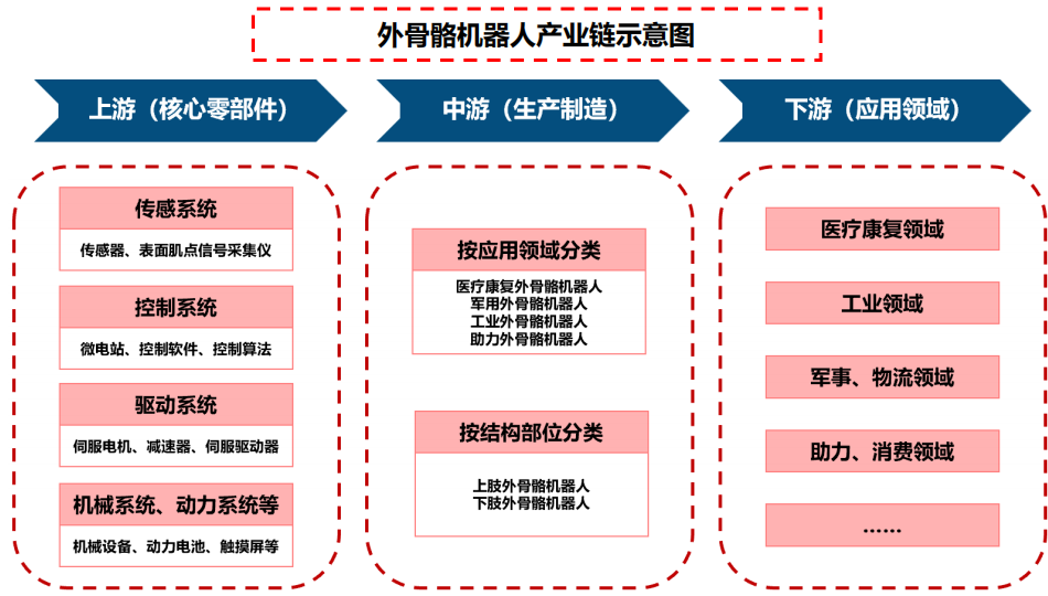 外骨骼机器人行业产业链主要分为三个环节:即上游的核心零部件供应商、 中游的生产制造企业及下游的终端应用领域。