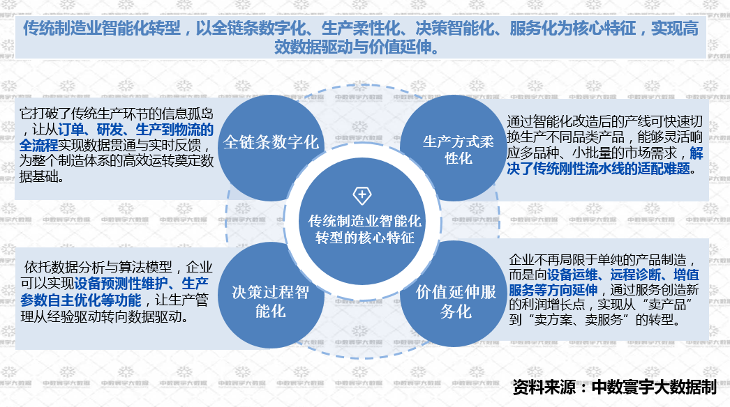 传统制造业智能化转型是我国制造强国战略的核心抓手,也是推动工业经济从规模扩张向质量效益提升的关键路径。这一转型并非简单的设备更新或技术叠加,而是以新一代信息技术为核心驱动力,对制造业研发、生产、管理、服务全生命周期进行系统性重构的产业变革。它既承载着提升生产效率、降低运营成本、增强核心竞争力的现实目标,也肩负着培育新质生产力、构建现代化产业体系、实现制造业高端化、智能化、绿色化发展的长远使命。本章将从行业核心特征、发展历程与产业链结构三个维度,系统梳理传统制造业智能化转型的内涵边界、演进脉络与产业生态,为后续分析市场格局与竞争态势奠定基础。