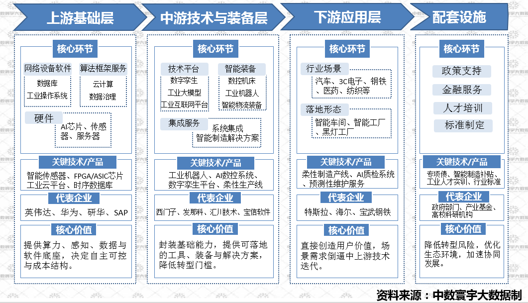 传统制造业智能化转型的产业生态链,上游基础层以AI芯片、传感器、工业操作系统、数据库等软硬件为核心,英伟达、华为、SAP等企业提供算力、感知与数据底座,决定了产业自主可控性与成本结构。中游技术与装备层通过数字孪生、工业大模型、工业机器人、系统集成等技术与服务,由西门子、发那科、汇川技术等企业封装为可落地的工具、装备和解决方案,大幅降低企业转型门槛。下游应用层则面向汽车、3C电子、钢铁、医药等行业,以智能车间、智能工厂为落地形态,特斯拉、海尔、宝武钢铁等企业将柔性制造、AI质检等技术转化为实际生产价值,同时场景需求又反向驱动中上游技术迭代。配套设施层则通过政策支持、金融服务、人才培训与标准制定,由政府部门、产业基金、高校科研机构等主体构建生态保障体系,降低转型风险,推动全产业链协同发展,共同构成了从技术供给到需求牵引的闭环,助力传统制造业向高效、柔性、智能方向升级。