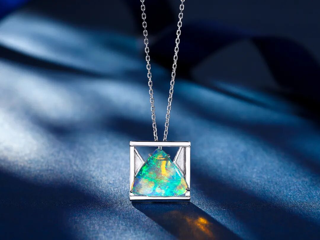 吊坠中心镶嵌了一颗极其明亮的蓝绿色铁欧泊,如星际漩涡中凝聚的极光,随光流转折射出蓝、绿、金的变彩。铁欧泊石来自澳大利亚昆士兰的瑰宝,铁欧泊以天然铁矿石为基底,形成独特的变彩效应,每一次轻微的转动皆焕发新生,堪称「会跳舞的宝石」。