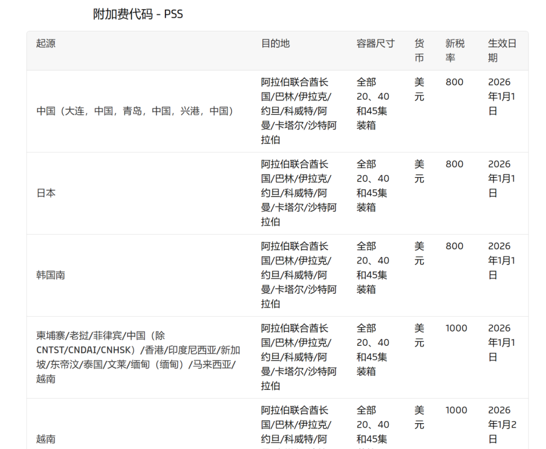 此外,马士基对亚洲多个地区至中东阿拉伯国家的航线也实施了PSS调整,费用在800-1000美元之间,根据不同起运地点有所差异。