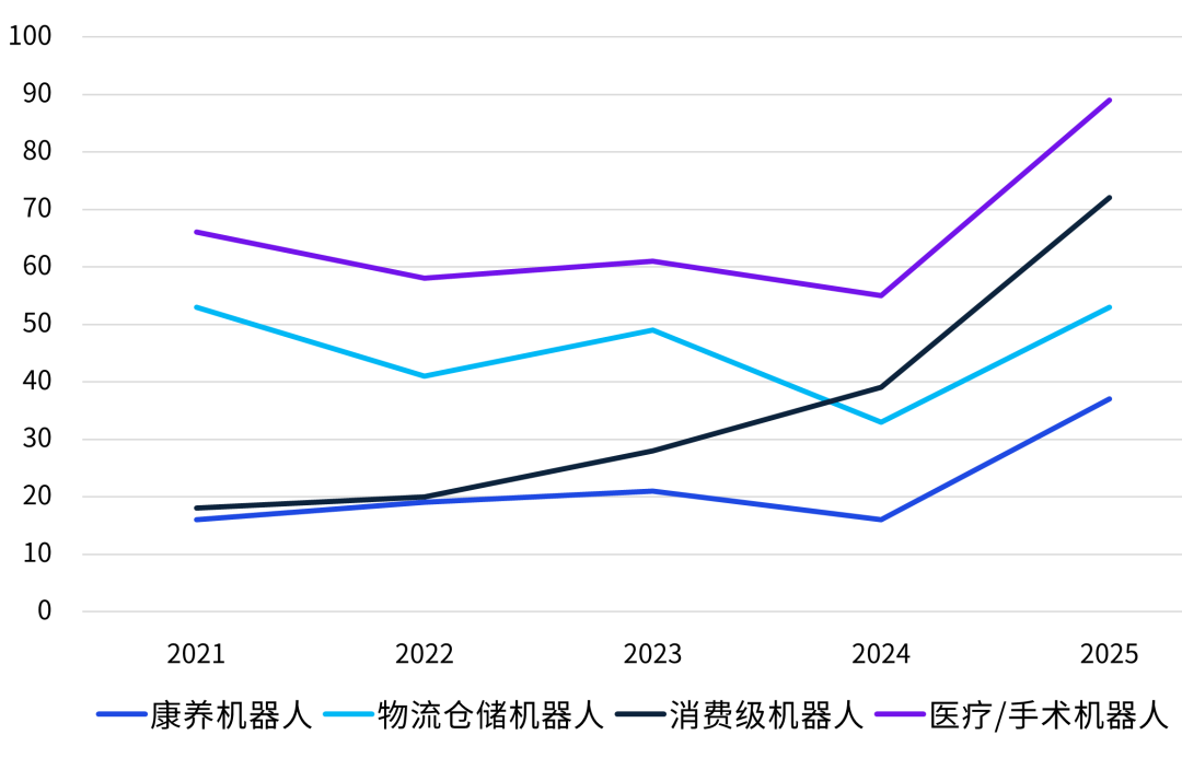 工业机器人作为传统主力,在“智能制造2025”政策推动和国产替代加速的背景下,2025年交易笔数显著回升,但整体占比下降了近7个百分点,这与制造业投资周期有强关联性,2025年热度的反弹也对应新一轮设备更新与自动化升级的需求。