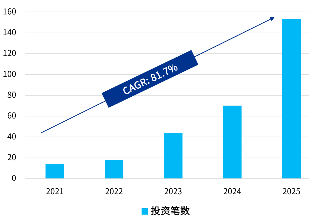 本文将人形、仿生(人)机器人、灵巧手及足部机器人等纳入人形机器人分析样本范畴。2021年至2025年间,该领域投资笔数增长近11倍,年均复合增长率达81.7%,行业正站在“规模化落地”临界点,资本聚焦硬件成本下降与场景验证(如工厂实训、家庭服务试点)。