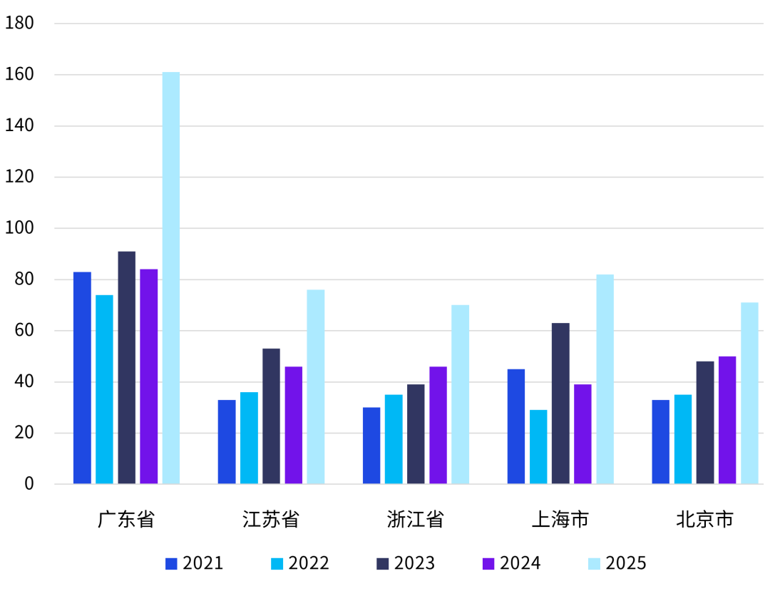 图3:2021-2025年机器人投融资区域分布(单位:笔数)