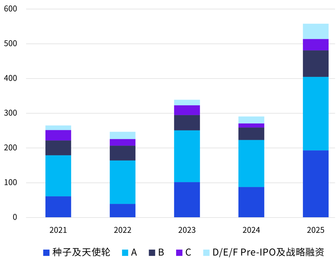 图2:2021-2025年中国机器人领域投资轮次(单位:笔数)