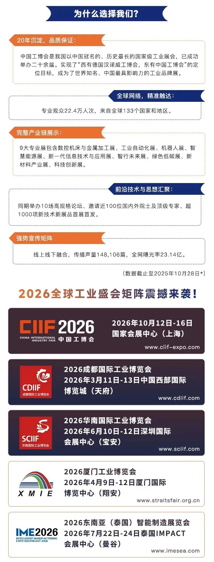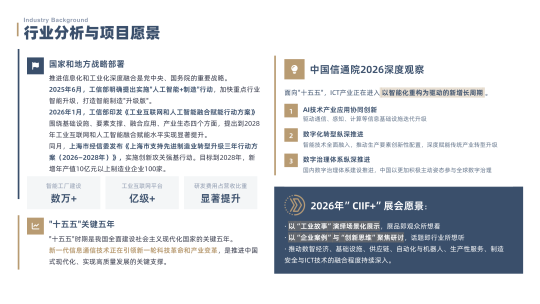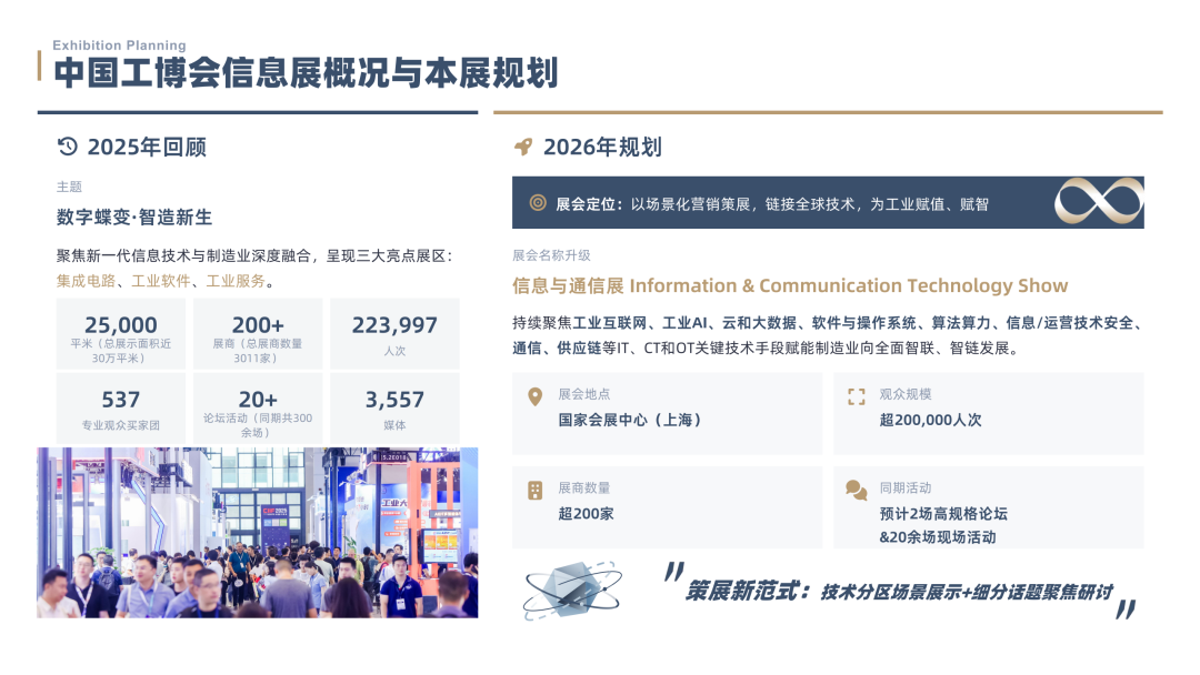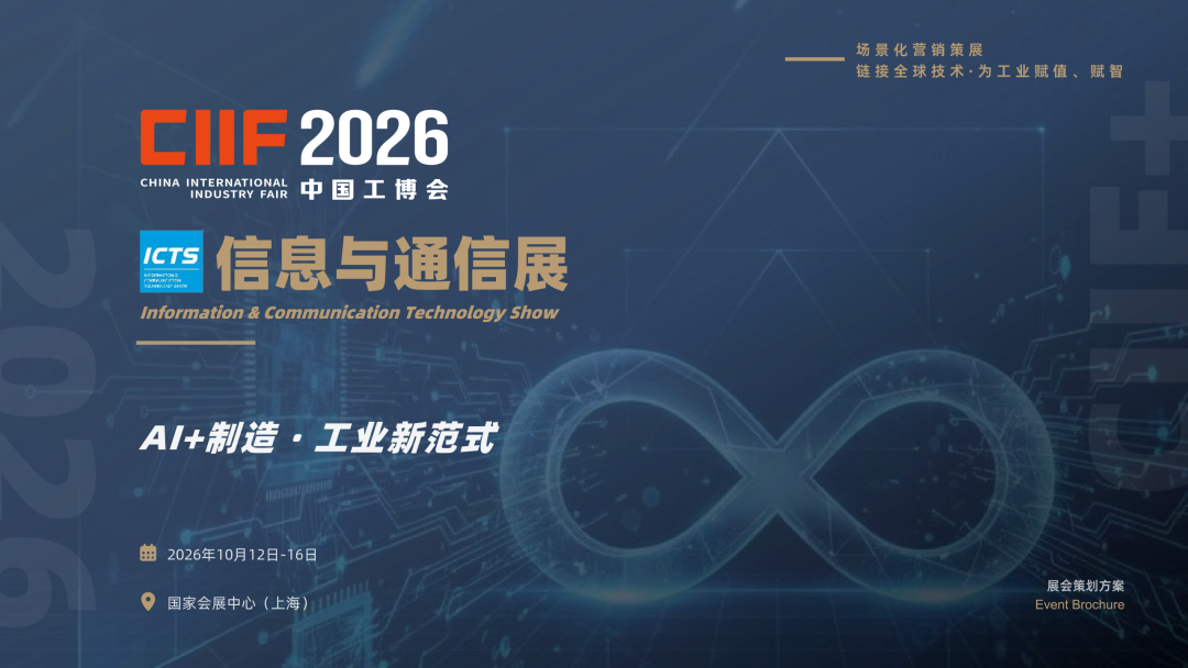 当人工智能与制造业深度交融,当数字技术重构产业未来,一场链接全球 ICT 技术、赋能工业高质量发展的盛会即将启幕。2026 中国国际工业博览会信息与通信展(CIIF-ICTS)将于10 月 12 日 - 16 日登陆国家会展中心(上海),以 “AI + 制造・工业新范式” 为核心,打造场景化、专业化、国际化的工业技术交流与产业对接平台。