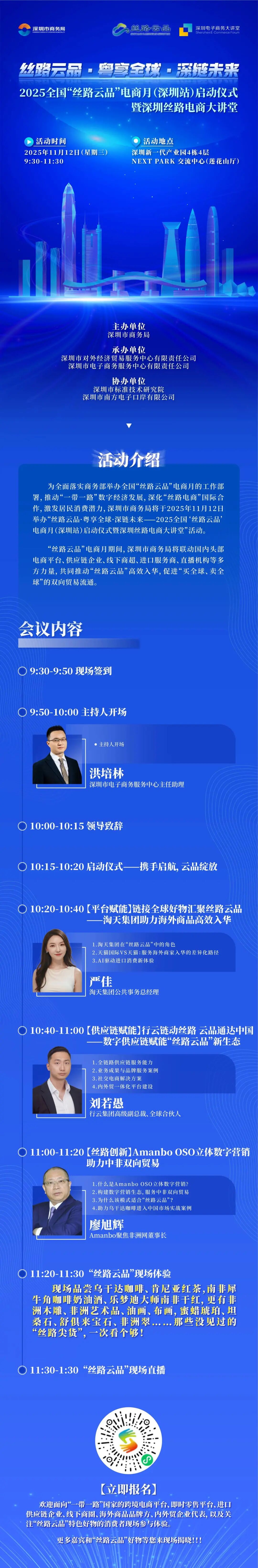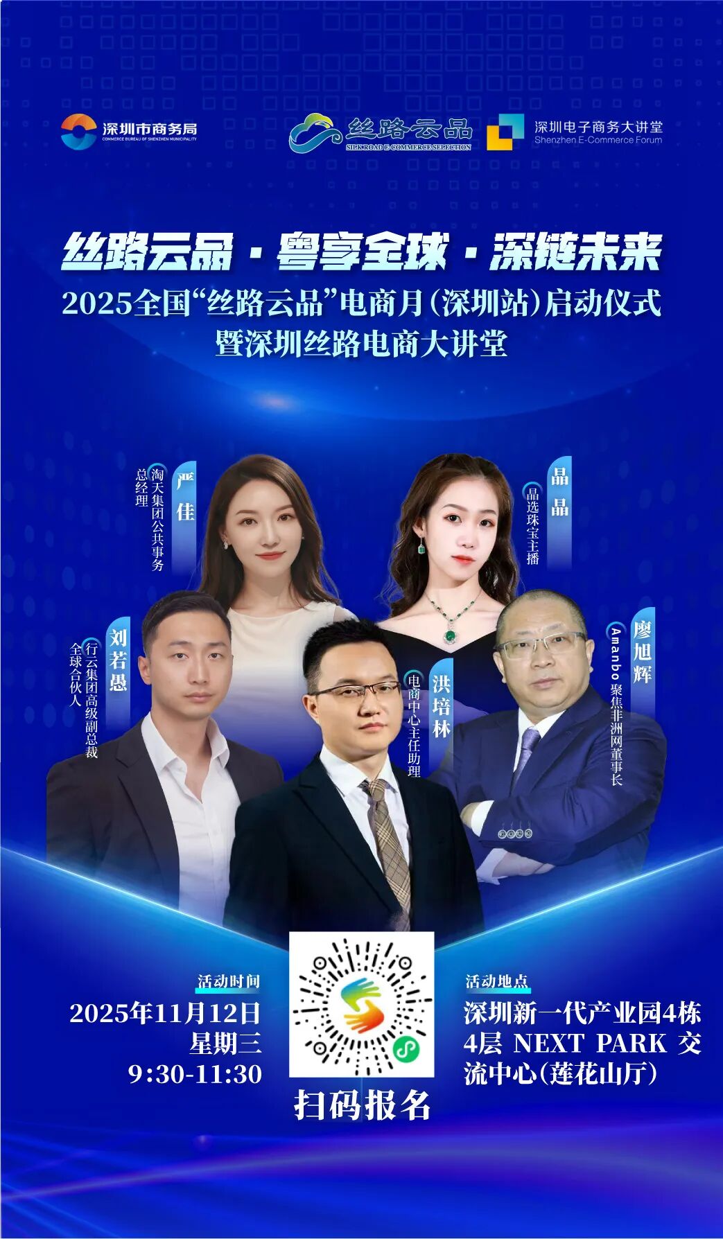 11月12日上午,深圳市商务局主办,深圳市对外经济贸易服务中心、深圳市电子商务服务中心承办,深圳市标准技术研究院、深圳市南方电子口岸协办的2025全国“丝路云品”电商月(深圳站)启动仪式暨深圳丝路电商大讲堂将在深圳新一代产业园启幕!政企合力、行业大咖、淘宝主播、丝路好物齐聚,等你来打卡!