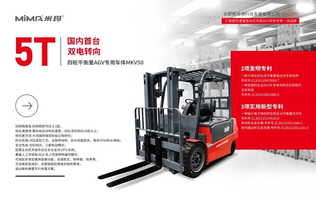 合肥搬易通(MiMA米玛)创立于1994年,是一家集高端电动叉车设计、生产、销售于一体的高新技术企业。公司占地面积7.2万平方米,员工人数超780人,拥有超140人的高素质研发团队,340余项国家技术专利,其中国家发明专利120+,并参与起草与制订9项国家标准,是安徽省首批国家级重点“专精特新”小巨人企业。