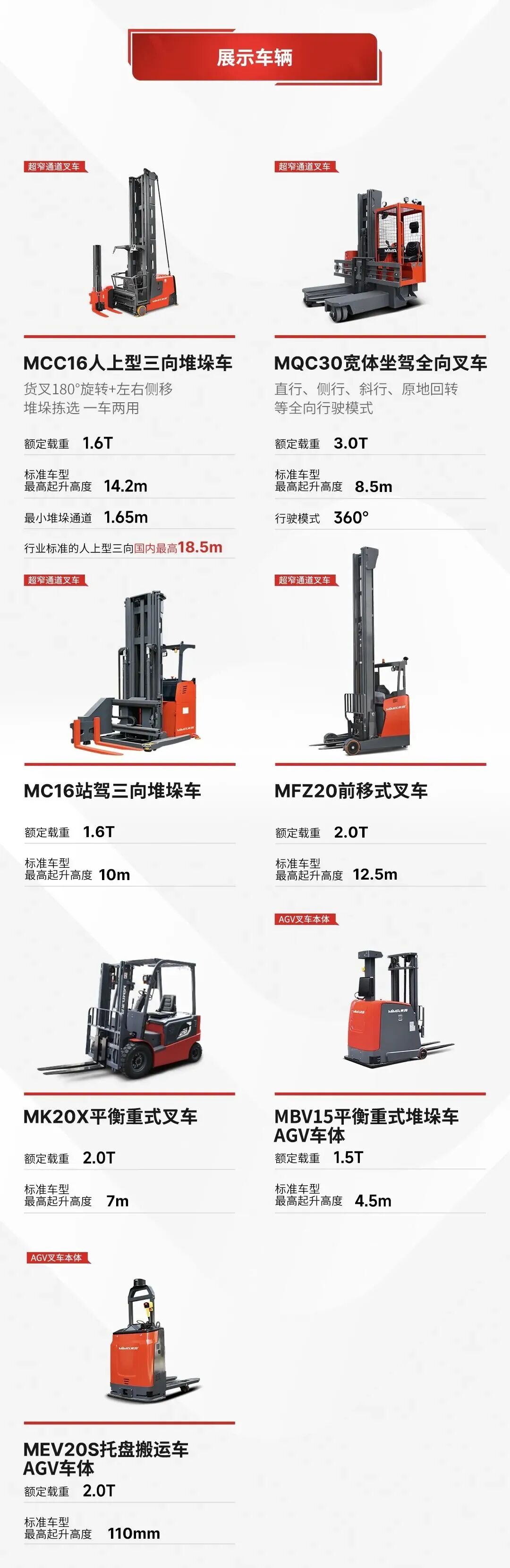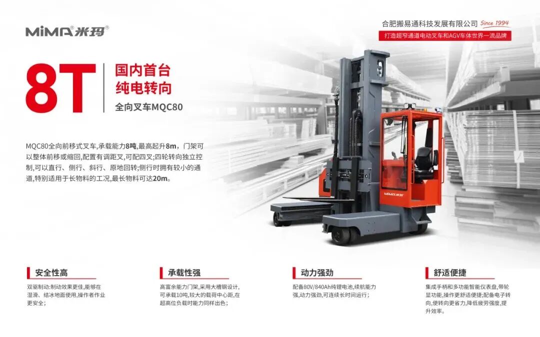 MiMA超窄通道系列叉车包括三向堆垛车、全向/四向叉车、铰接式叉车。该类叉车主要用于窄通道货架仓储,具有高起升、高效率等特点,全向/四向叉车专门适用于长物料的搬运和堆垛。