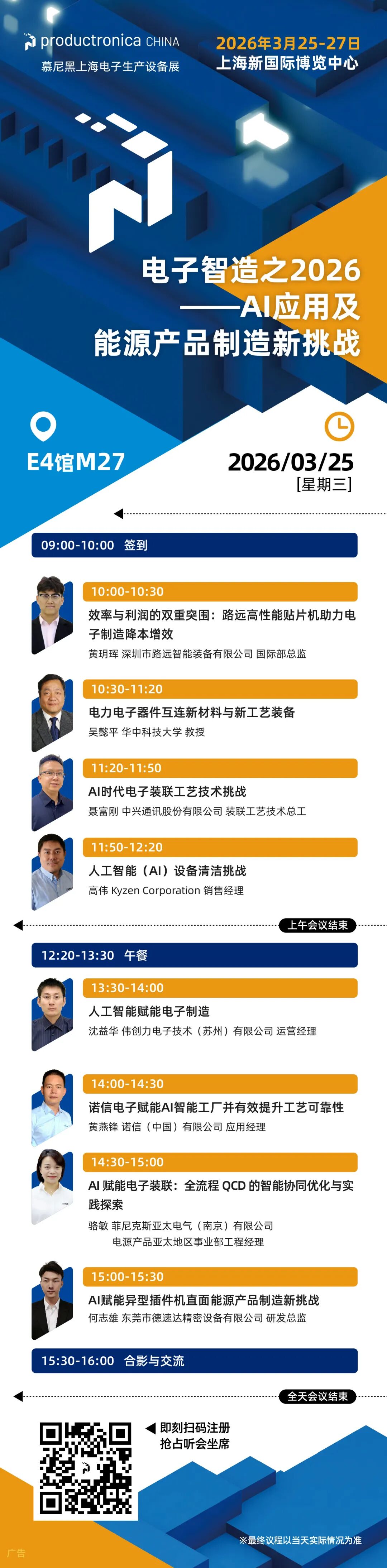 本次研讨会将聚焦两大驱动电子制造格局的核心引擎:AI的全面渗透与能源产品制造的革新与挑战。在算力爆发、绿色转型的时代背景下,电子制造业正站在新一轮变革的起点。我们旨在汇聚业界智慧,共同探讨前沿技术,应对严峻挑战,共创智能、可靠、可持续的制造未来。