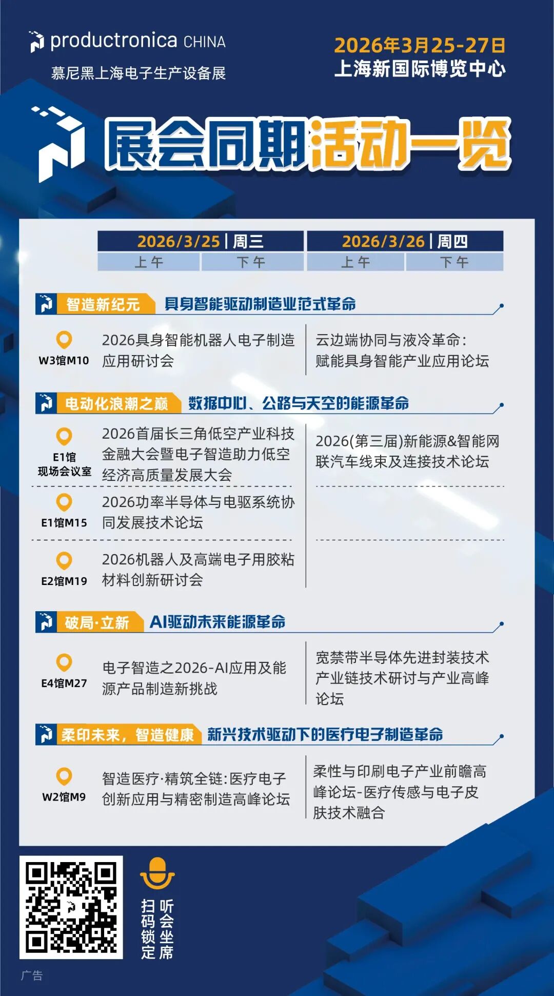 2026年3月25至27日,2026慕尼黑上海电子生产设备展(productronica China)将在上海新国际博览中心(E1-E5, W1-W4馆)盛大举办。作为电子制造行业重要的展示与交流平台,本届展会以近100,000平方米展示面积、超1,000家参展企业的规模,聚焦汽车、工业、通讯电子、医疗电子等多领域需求,旨在为行业呈现一场覆盖电子生产全产业链的“创新盛宴”,重点聚焦智慧工厂、新能源汽车技术及数字化未来。