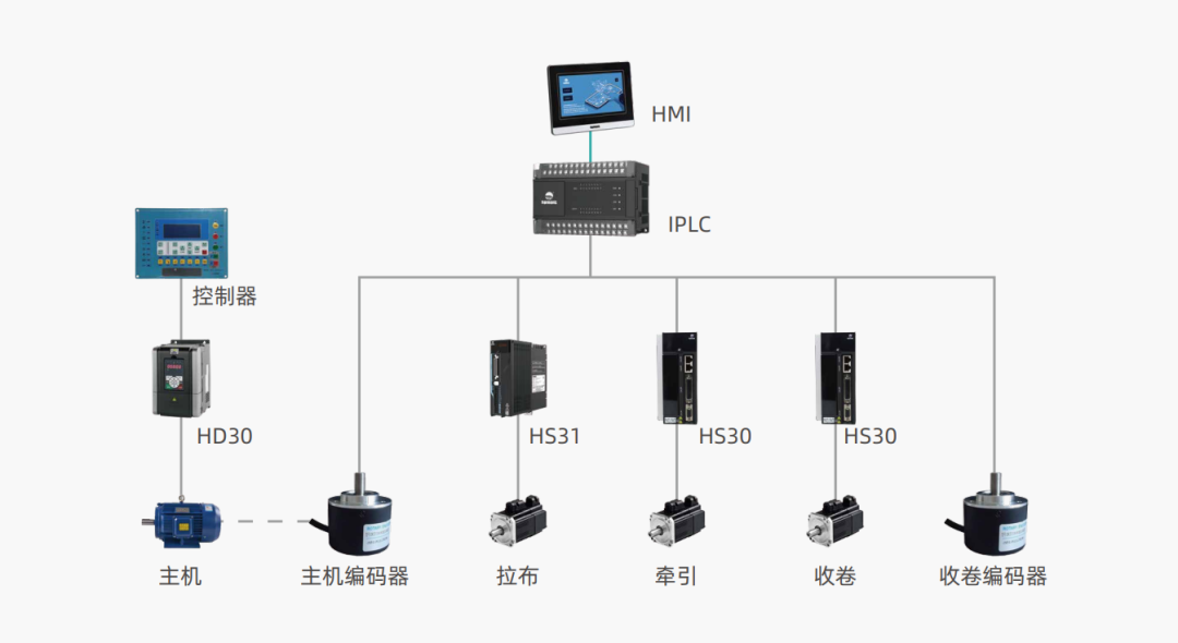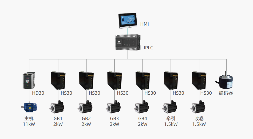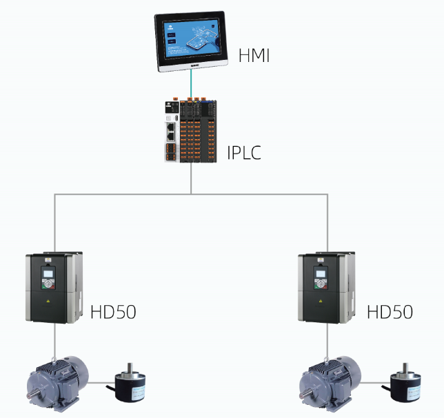 项目配置:HD09 变频器、HD50 变频器、HC10 PLC、HV01 HMI