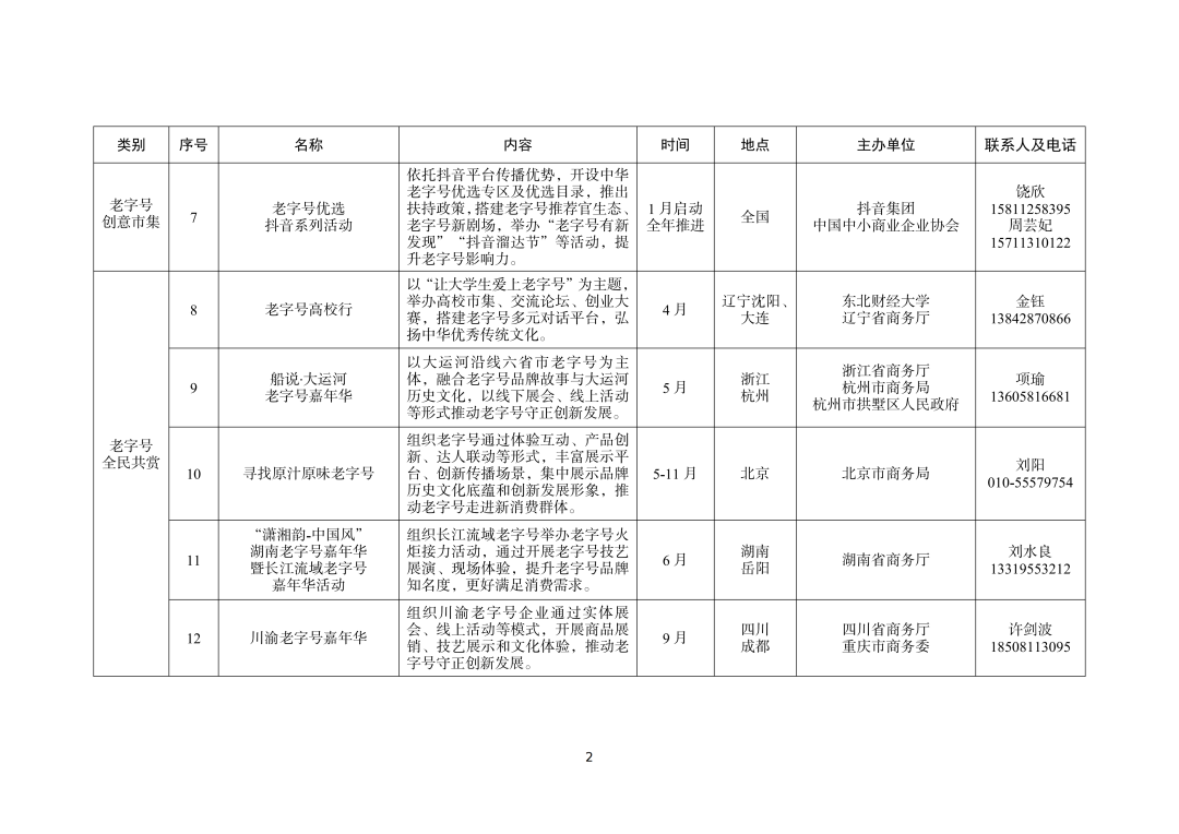 1.老字号创意市集。聚焦春节、元宵等传统节日,抢抓老字号消费旺季,依托步行街(商圈)、商业综合体、街道社区等公共空间,结合传统民俗和地域文化打造沉浸式年货市集,引导老字号推出一批融合生肖文化、节令习俗的精品年货及文创产品,打造集销售、展览、体验于一体的“一站式”购物平台和“打卡地”消费场景,营造“老字号伴你团圆”消费氛围。