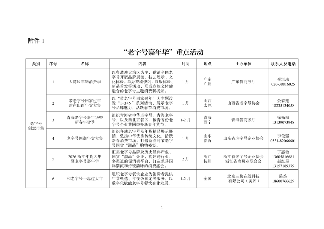 (一)1场启动仪式。商务部将联合有关地方人民政府举办全国“老字号嘉年华”启动仪式,发布全年活动安排、现场组织商品展销和技艺展示,全面启动“老字号嘉年华”系列活动。