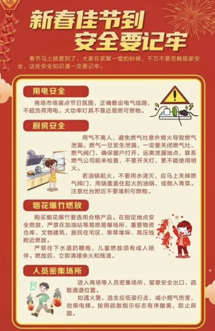 假期出行务必选择正规交通工具,拒绝黑车与超载车辆,全程系好安全带。居家时注意用电用气安全,人离电断、人走火熄,防范火灾与一氧化碳中毒风险。