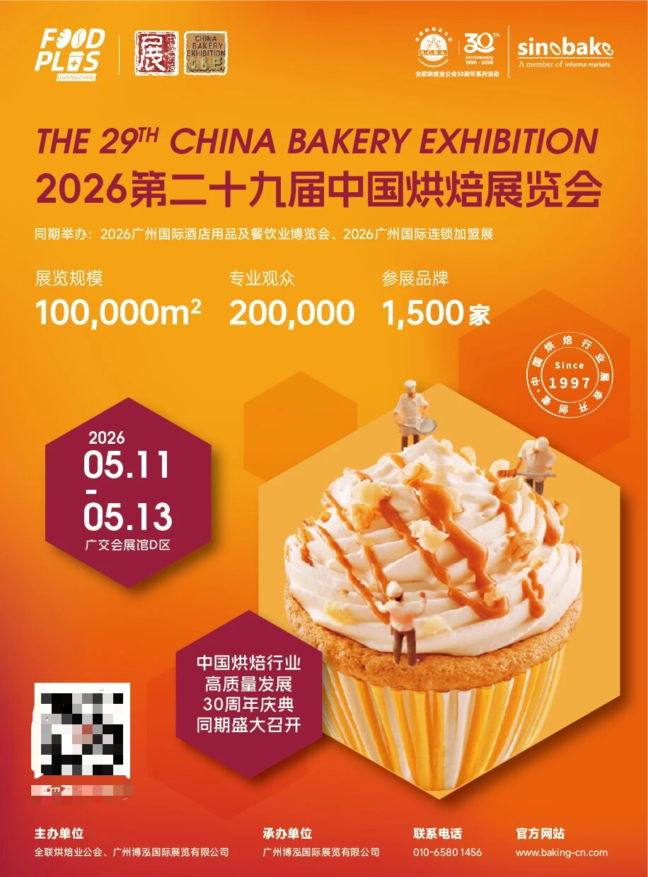 2026年正值中国烘焙业高质量发展30周年,作为行业开年首场“烘焙+”盛会,2026第二十九届中国烘焙展将在广州广交会展馆D区隆重揭幕!同期与HOTELEX广州国际酒店用品及餐饮业博览会、FHC华南进口食品展以及GIFE广州国际连锁加盟展以创新联动方式组成广州国际烘焙+食饮产业联展(FOOD PLUS GUANGZHOU)。多展联动为中国烘焙+食饮产业链上下游企业打造更广阔的交流服务平台,推动中国烘焙业与国际市场深度接轨,开启“品质创新向未来”的新篇章!