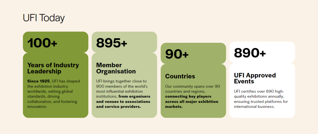 全球展览业协会The Global Association of the Exhibition industry)于1925年在巴黎成立,其前身为国际展览联盟(法文Union des Foires Internationales,简称“UFI”),是全球最具影响力的会展业协会之一,也是迄今为止世界展览业最重要的国际性组织,有“世界展览业WTO”之称。