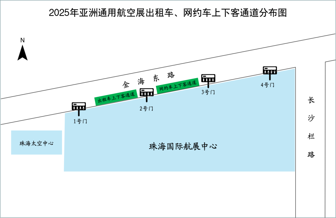 为方便观众乘坐出租车和网约车观展,亚洲通用航空展期间在航展中心1号门—2号门之间设立出租车临时上下客通道,在2号门—3号门之间设立网约车临时上下客通道,乘坐出租车或网约车往返展区的观众可在相应通道快速上下车。