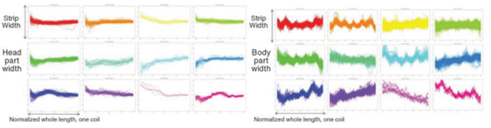 图中,y轴表示宽度偏差,x轴表示归一化长度。例如,在左上角的框架中,128个带卷的红色分类图表显示,许多带卷具有类似的宽度偏差行为,其中头部部分比目标更宽。通过查看中间部位的分类结果,用户可以识别大多数波动,例如滑痕或宽度变化。这些信息有助于用户确定提高宽度精度的有效方法,例如调整带卷头部的短时间的轧制过程控制。