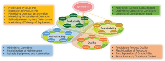 本节列出的例子说明了这一点,尽管在控制系统方面并不新鲜,但数字化的兴起导致了向预测分析的转变和优化目标的扩大。为了确保准确预测和测量更复杂的性能指标,需要大量数据,包括来自2级系统、实验室测试、传感器和物联网设备的信息。当与自动化和优化最佳实践一起实施时,数字化解决方案可以在生产力、可持续性、质量和可维护性等关键领域对优化工厂运营产生深远影响,如图2所示。