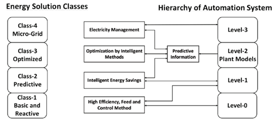 为了本文的目的,适用于各种钢铁设施和工艺的节能解决方案可以分为四类。这些在图3的左侧进行了说明。第一类包括提供带有高效设备和带有反馈回路的能源控制的基本包。第二类是智能节能方法,利用来自其他功能的预测信息,例如热轧带钢轧机模型和控制器。第三类是寻求在更大范围内优化能源使用的另一种形式的智能方法。最后,第四类的重点是钢厂的电力管理,并利用预测信息。