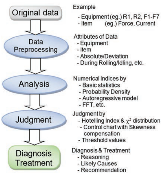 (第一行:原始数据:例如:设备R1R2F1~F7,即所有粗轧机和精轧机组,项目:如轧制力,电流;第二行:数据预处理:数据属性:设备,项目,绝对值/偏差值,轧制期间/空载运行,等等;第三行:分析:数值指标:基本统计,概率密度估计,自回归模型,FFE等;第四行:判断:判断由:霍特林指数和χ2分布,带有偏度补偿的控制图,阈值;第五行:诊断处理:诊断和处理:推理,可能的原因,建议)