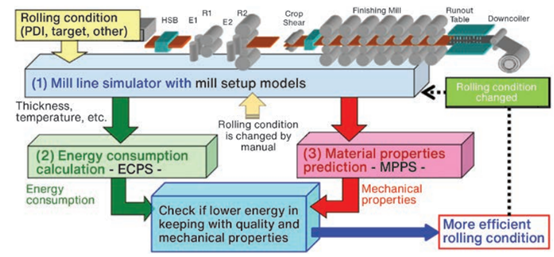 该系统使用从3级系统发送下来的产品数据输入(PDI)数据,为轧机提供动态控制和轧制模型设置的初始计算。能源消耗预测系统(ECPS)根据模型设置的输入预测材料轧制所需的总能量,而材料性能预测系统(MMPS)计算材料的强度和延伸率。这些计算在设置模型、能量预测系统和材料性能预测之间形成一个迭代循环,以达到最优值。[3]