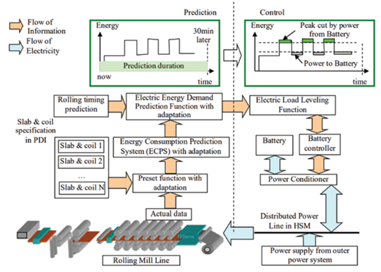 预测系统(如图左侧所示)包括两个关键组件:ECPS,用于预测使用的电力,以及轧制定时预测功能。控制系统(如右侧所示)包括负载均衡功能,可以利用电池或生产重新调度来减少峰值电力需求。[3]