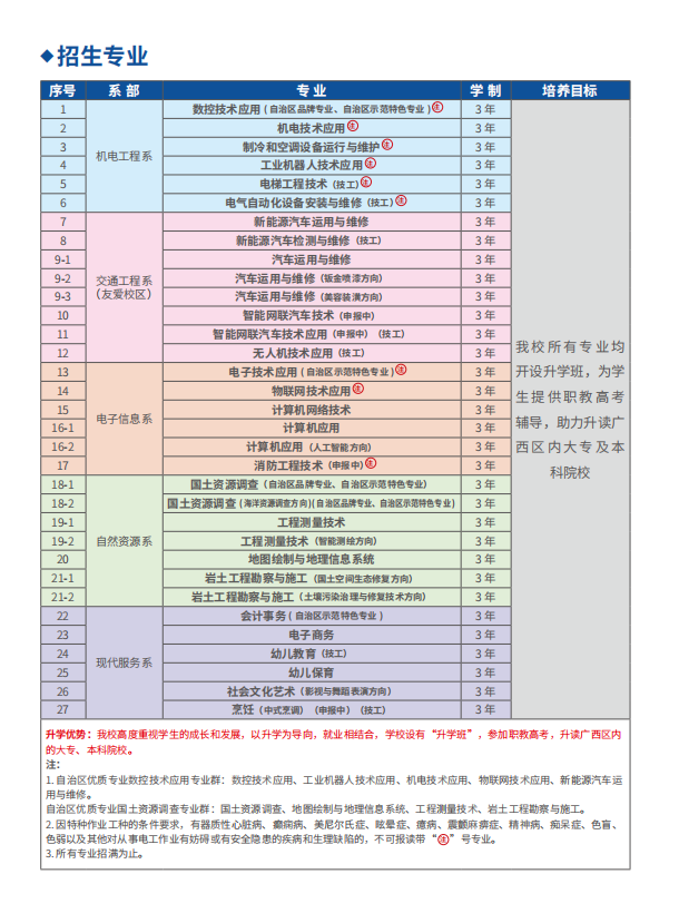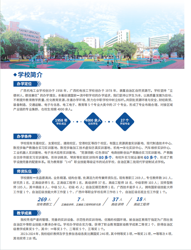 广西机电工业学校创办于1958年,广西机电技工学校创办于1978年,隶属自治区自然资源厅。学校坚持“立德树人、德技兼优”的办学理念,本着创建国家一流中职学校的办学追求,我们坚持以学生为本,以高质量发展为目标,不断提升教育教学质量,优化教育资源,改善办学环境,努力在中职学校中树立标杆。共获批资源环境与安全、财经商贸、装备制造、交通运输、电子与信息、电工电子、教育等5个专业大类中的27个专业,形成了专业布局合理,对接区域产业链的专业集群,在校生规模4000余人。