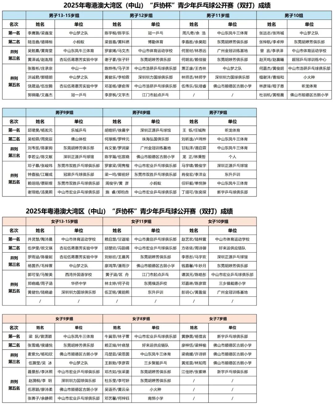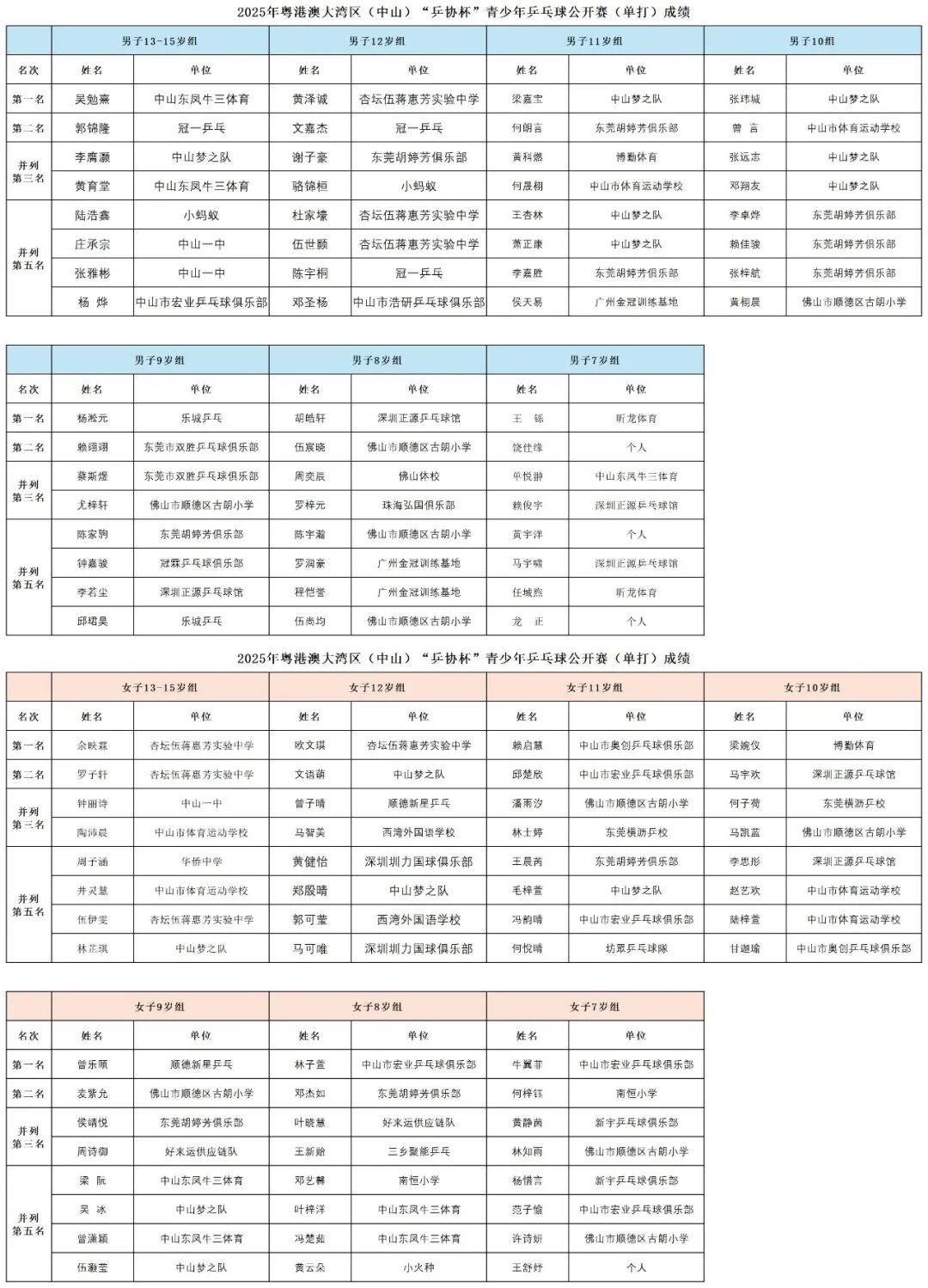 经过两天的激烈角逐,各项目、各组别的冠亚季军相继产生。本次赛事不仅为大湾区青少年乒乓球爱好者搭建了交流球技、增进友谊的优质平台,更有力推动了区域内青少年乒乓球运动的普及与发展,为挖掘和培养乒乓球后备人才注入了新的活力。中山市乒乓球协会会长高华平表示,未来将持续举办此类高水平青少年赛事,以球为媒深化粤港澳大湾区体育交流合作,助力区域体育事业协同高质量发展。