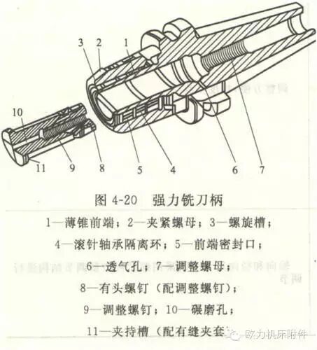 f.强力铣刀柄 强力铣刀柄的刀体厚实,刚性高,振动少;刀头内部带有螺旋槽和窄槽,夹持加强、跳动精度高(5μm以