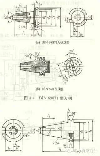 d.DIN 69871型(简称JT、DIN、DAT或DV)刀柄 DIN 69871型分为两种,即DIN 69871A/AD型和DIN 69871B型,前者是中心内冷,后者是法兰盘内冷,其它尺寸相同,如图4-4所示。