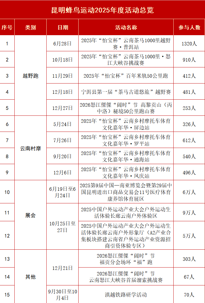 回顾过去一年,于蜂鸟运动而言,宛如一段踏浪而行的奋进征程,镌刻着拼搏的足迹,饱含着成长的沉淀,更盛满了突破的荣光。这一年,我们以初心为舵,以专业为帆,在户外活动策划、赛事运营与展会服务的多元赛道上稳步疾驰,锐意创新;凭借精准的定位与高效的执行,圆满落地了一场场兼具影响力与口碑的活动赛事,在云南户外文体行业的版图中持续深耕,收获了市场的认可与伙伴的信赖。