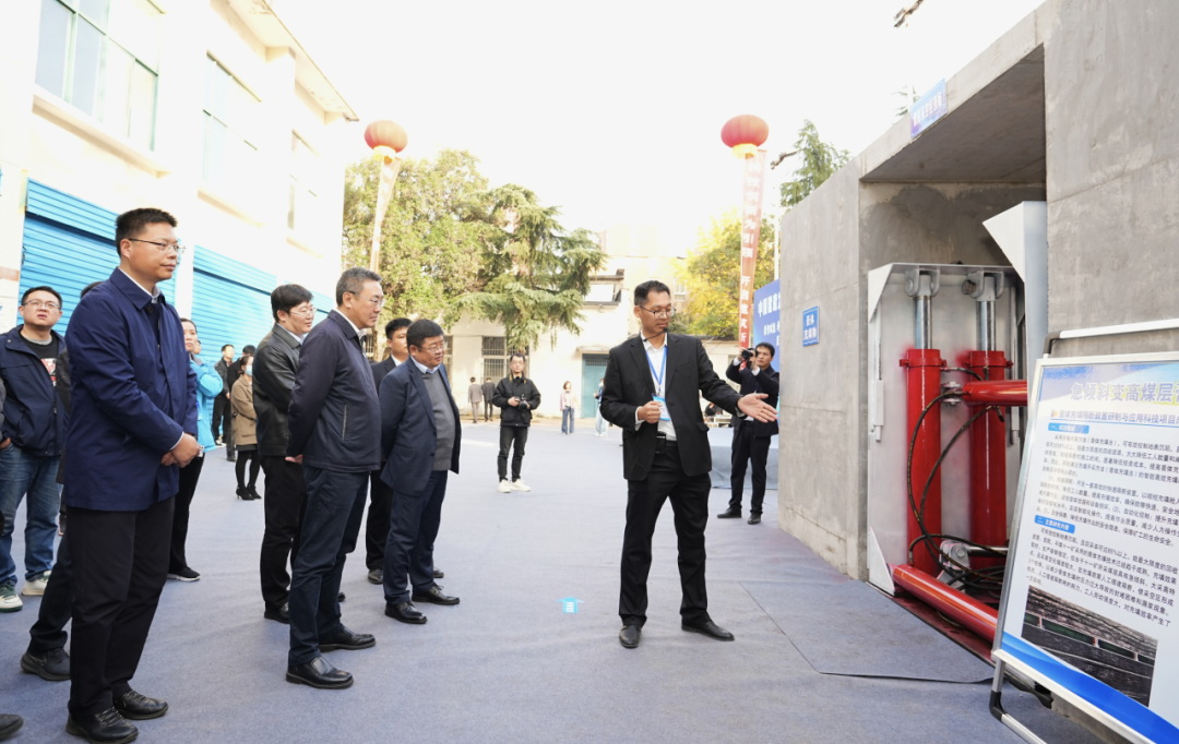 与会嘉宾参观平煤神马建工集团,讲解人员介绍矿用膏体充填舱快速隔断装置第三代样机