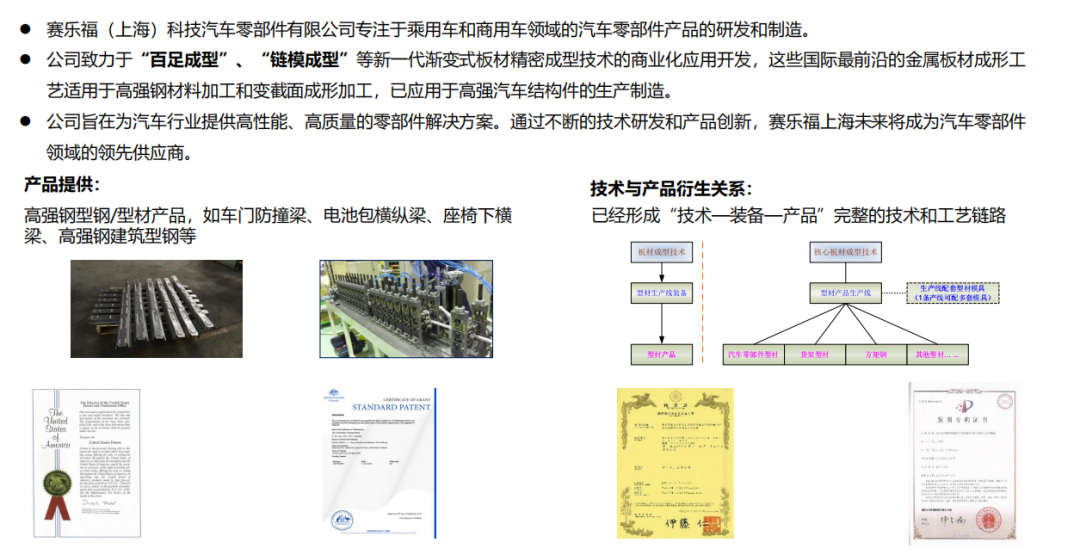 赛乐福(上海)科技专注于乘用车和商用车领域的汽车零部件产品的研发和制造。公司致力于“百足成型”、“链模成型”等新一代渐变式板材精密成型技术的商业化应用开发,这些国际最前沿的金属板材成形工艺适用于高强钢材料加工和变截面成形加工,已应用于高强汽车结构件的生产制造。公司旨在为汽车行业提供高性能、高质量的零部件解决方案。