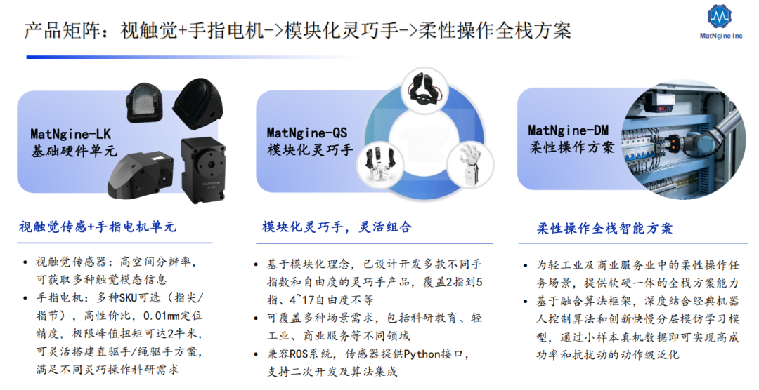 迈特擎机器人(MatNgine Robotics)成立于2025年3月,核心团队主要来自清华、交大、同济、约翰霍普金斯、卡内基梅隆、期智研究院等知名高校及研究所,具备完整的软硬件及算法开发能力,并在工业领域有丰富经验。团队擅长柔性体力控操作技术,致力于用自研的手指电机模组及高敏视触觉感知套件,模块化打造构型灵活多样的高自由度末端,结合模仿学习算法RDP,以突破工业场景中各类柔性体力控操作的技术与成本痛点。目前已在线束、皮革等细分工业场景逐步开展落地应用,并和优秀的具身大脑、视觉、数采及自动化公司达成战略合作关系。